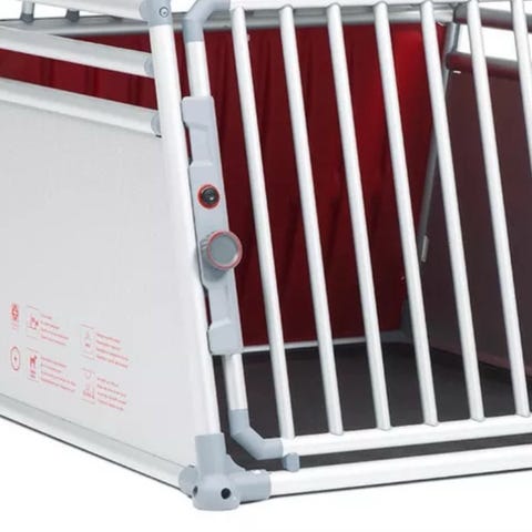 4petsPro hundebur(medium) laget av metallramme og plastpaneler. Buret har en dør med låsemekanisme og er designet for sikker transport av hunder. Fargene er grå metallramme med røde plastpaneler. Buret er egnet for bruk i bil eller til andre transportformål.