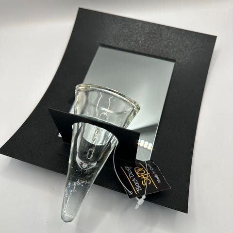 Pent lysskjold i gullmalt tre med fint speil og lysholder i sort metall selges.