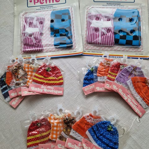 Selger en dukke med vogn, klær og utstyr.