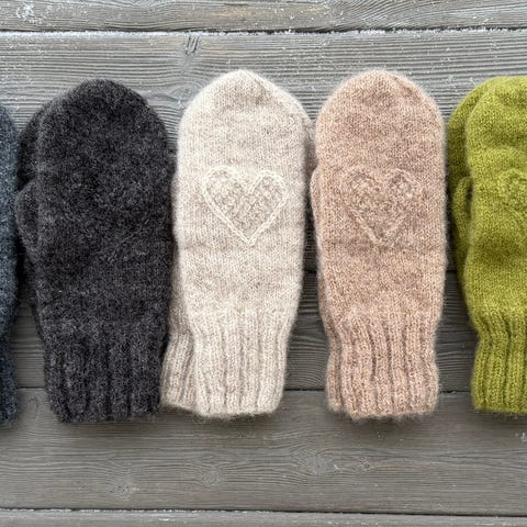 Votter strikket i fritidsgarn og vams. Lett tovet.