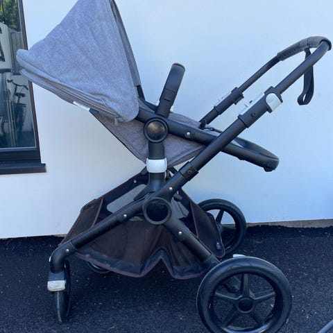 Det følger med grå kalesje som er som bleket .