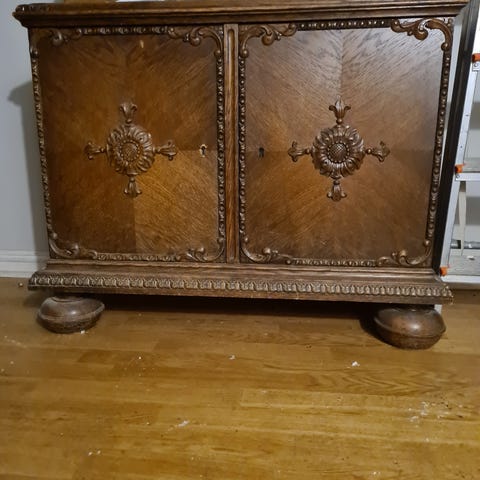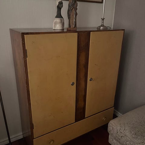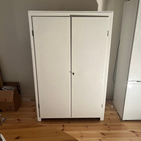 Selger stort solid garderobeskap i mørkt treverk, en skuff nederst. Stort speil i døra. Selges billig da det kreves 3 personer for å frakte det ut.