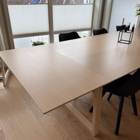 Bordet har ileggsplate og blir da forlenget til 180 cm. Ileggsplaten oppbevares under bordplaten når den ikke er i bruk.