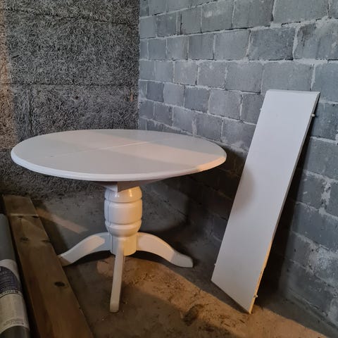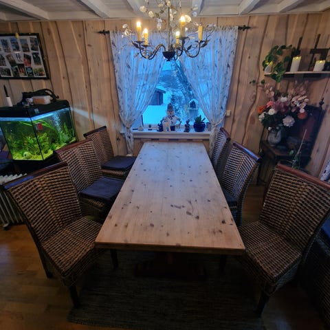 Laget på snekkerverksted og derfor solid håndverk. Bord m/6 stole og puter. To forlengelsesplater på 40 cm følger med. Alt er pent brukt og godt behandlet.