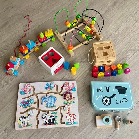 Selger 5 forskjellige treleker. Stabletårn, puttekasse og leke med geometriske former fikk vi i gave og er ikke brukt - helt nye. Pusle-og fiskespill har noen bruksmerker. Selges samlet.
