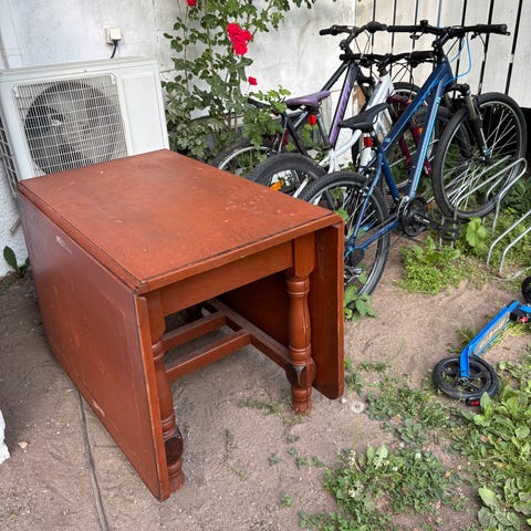 Det er opprinnelig et stuebord, men jeg har satt på treklosser på bunnen for å heve bordet. Det er brukt som et lite kjøkkenbord. Klossene kan tas av ved behov. Litt slitt og flekkete, kan pusses ned. Et par skruer under kan med fordel strammes.