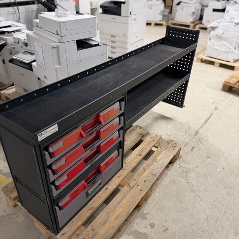 Solid bil innredning. Langs gående med skuffer bak og venstre skyvedør og hylle på toppen.