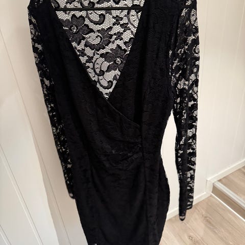 Nelly festkjole i størrelse M, oppleves litt romslig instørrelen. Den når til rett over knærne på meg som er 165 cm høy. Kjolen har lange ermer, jeg har satt en sikkerhetsnål i utringningen, men denne kan enkelt tas bort :)