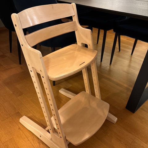 Kinderkraft høy barnestol i tre. Stolen er laget i tremateriale og er designet for barn. Den har justerbare seter og fotstøtte for tilpasning til barnets størrelse.