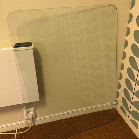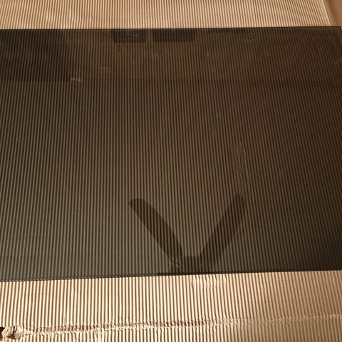 Gulvplate i glass til å ha under vedovn, med avrundede hjørner.