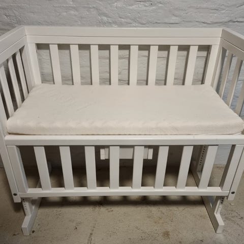 JLY bedside crib laget i hvitt materiale. Designet for å plasseres ved siden av foreldresengen for enkel tilgang til barnet. Utstyrt med hjul for enkel flytting og avtakbar side for fleksibel bruk.