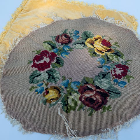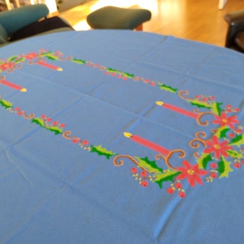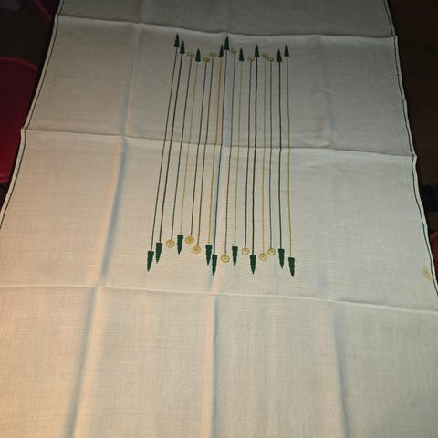 Tilstand: Duken er generelt i god stand, men har en liten, svak gul flekk på ett sted (se bilde) som sannsynligvis kan fjernes med riktig flekkfjerner. Den har også et par bittesmå hull som er naturlige i denne typen tekstil.