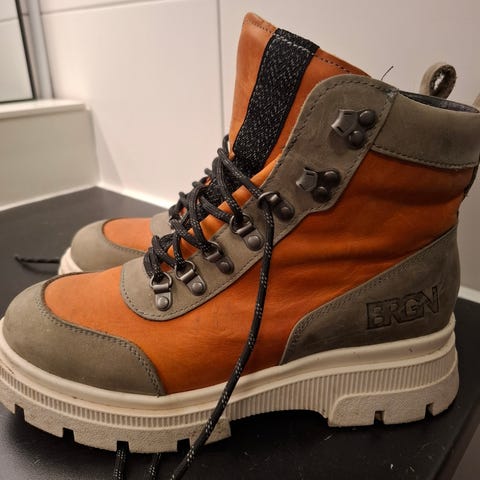 BRGN Støvler størrelse 40 i brun/blå farge. Robust såle med godt grep, egnet for utendørs bruk.