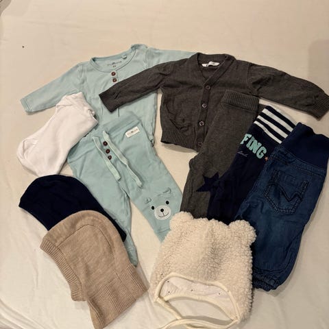 Barneklær for gutt i størrelse 62 med flerfarget design. Sett med ulike plagg som bodyer og heldresser i forskjellige mønstre og farger.