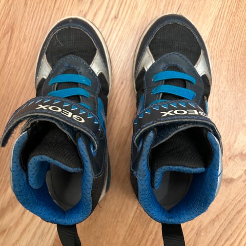 Geox sneakers for gutt i størrelse 25. Skoene er blå med hvite detaljer og har borrelås for enkel justering. Laget med pustende materiale for komfort. Kommer fra et røyk og dyrefritt frit hjemme