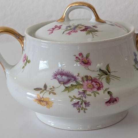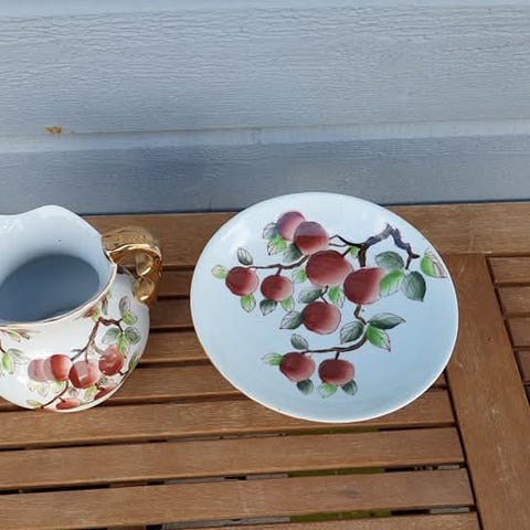 Håndmalt dekor med grønne blader og aksenter i 22 eller 24 karat gull.