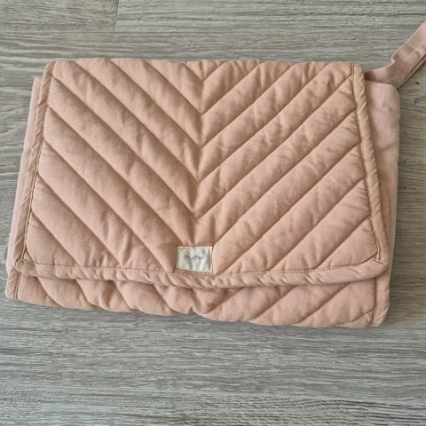 Så og si ubrukt praktisk stellemappe i øko bomull fra Mushie. Praktiske lommer til bleier, kremer og våtservietter.