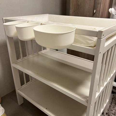 Stellebord mangler nederst hylla, ellers fungerer perfekt uten dette, men større opppbevaringsplass under :)