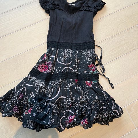 Vakker kjole med liv i lin og snøring i ryggen og silkeskjørt med tyll under. Et trykk på en side av skjørtet på den ene siden. Jeg har brukt et belte i livet med knyting som en lekker detalj og en sort liten topp til å dekke armene med hvis kjølig vær.