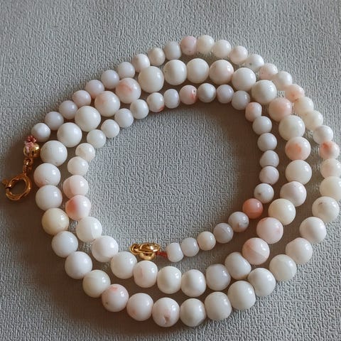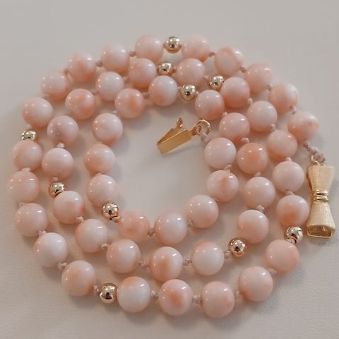 Selges nytt håndlaget halskjede og armbånd av edel japansk Englehud korall. Avstandperler er ekte ferskvann perler og gullbelagt kuler. Låsene er 14k gullfyllet. Armbåndet er justerbar og passer fra 17sm og oppover. Andre dimensjoner og vekt vises på bildene. Leveres med gaveeske. Hvis du har spørsmål skriv melding.