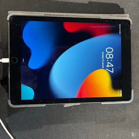Apple iPad nettbrett med 64 GB lagringskapasitet. Enheten har en skjerm med berøringsfunksjon og et bakre kamera. Fargen på enheten er hvit/gull.