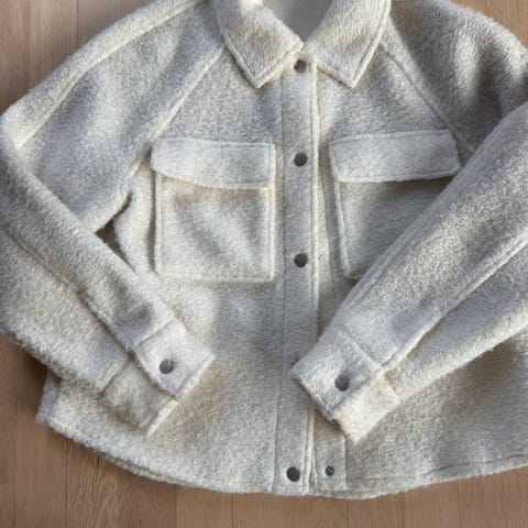 Zara damejakke i størrelse M. Jakken er beige og laget av fuskepels, noe som gir et mykt og varmt materiale. Jakken har knappelukking og to brystlommer med klaff.