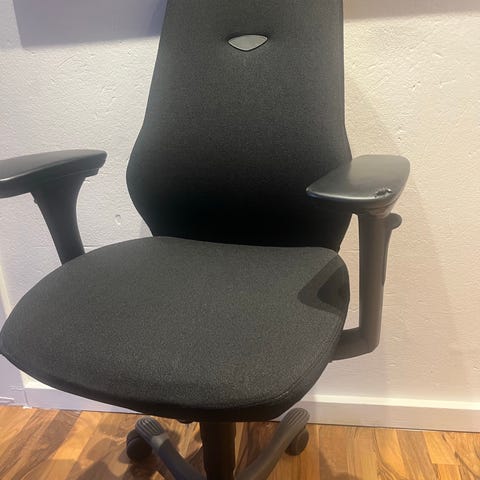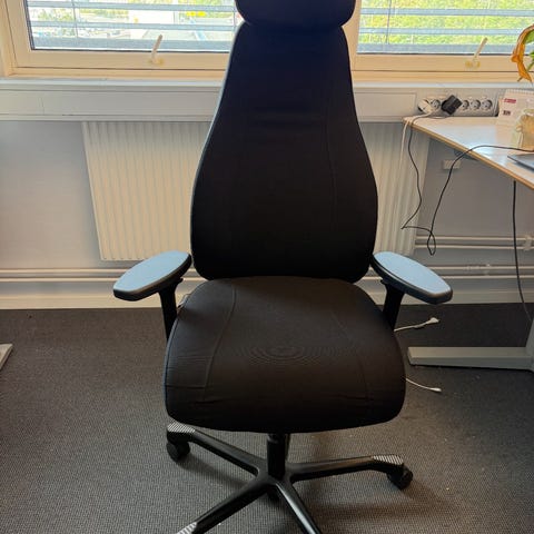 Selger en eldre, solid Kinnarps kontorstol i ekte skinn. Dette er en skikkelig kvalitetsstol bygget for lang levetid – ikke billig kontorvare.