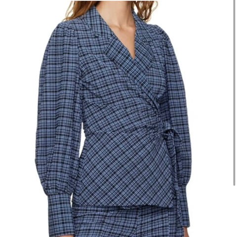 Bluse / topp fra Ganni, modell Seersucker Check Wrap Blouse. Pent brukt, kun brukt noen få ganger.