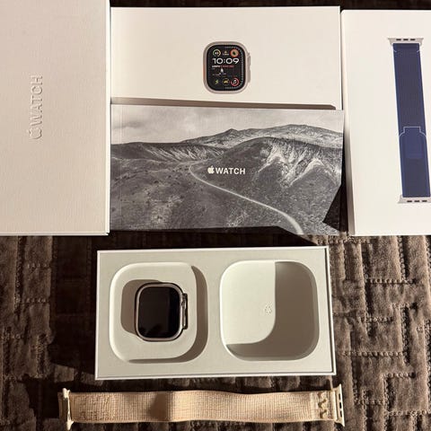 Apple watch Ultra 2 titan i svart farge. Lite brukt Apple watch ultra 2, ingen riper eller skader, selges med to klokke reimer. Orginal Ocean Blue og en magnetisk sort og orange. Alt følger med, eske, lader og det ovennevnte
