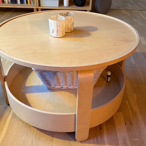 Rundt salongbord selges. Nypris 1400 kr. Bordet er stabilt og fint, men har synlige bruksmerker/riper på bordplaten (se bilder). Perfekt om du vil ha et pent bord til en rimelig pris eller pusse det lett opp. Pris: 500kr. 🙂