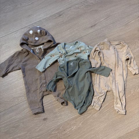 Barneklær i størrelse 50 og 56 flerfarget og designet for unisex bruk. Pakken inneholder ulike plagg egnet for små barn, laget i forskjellige materialer og farger. Inneholder også noe ull.ingen hull som jeg har sett.