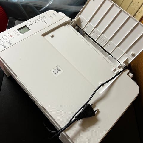 Canon TS5150 multifunksjonsskriver med fargeutskrift, skanning og kopiering. Inkluderer strømkabel og installasjons-CD. Enheten har en skjerm for enkel navigering og kontrollpanel med knapper for funksjonsvalg.