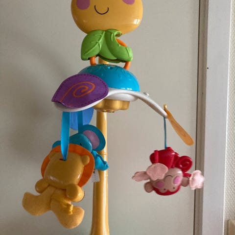 Designet for å henge over barneseng/babyseng eller stellebord for visuell stimulering av babyer. Dette er den uroen vi har vært mest fornøyd med, og vi har prøvd flere! Den er enkel å montere på seng eller bord og har en superkoselig melodi og fargerike dyr som babyer elsker!