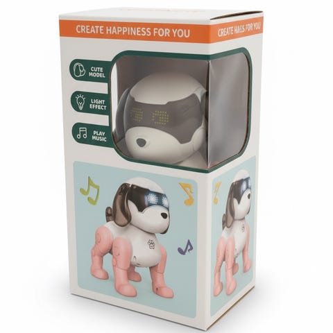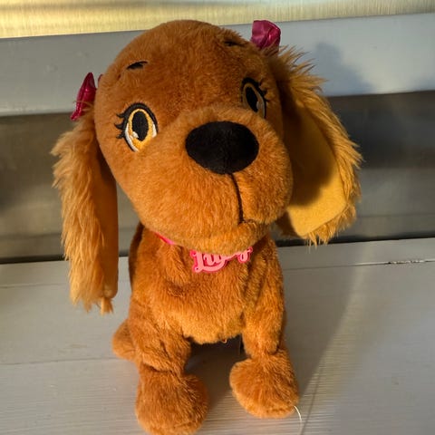 Lucy robothund leketøy i mykt materiale med brune farger og rosa sløyfer. Passer for barn som kosedyr eller lek.