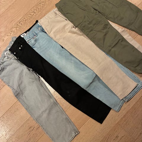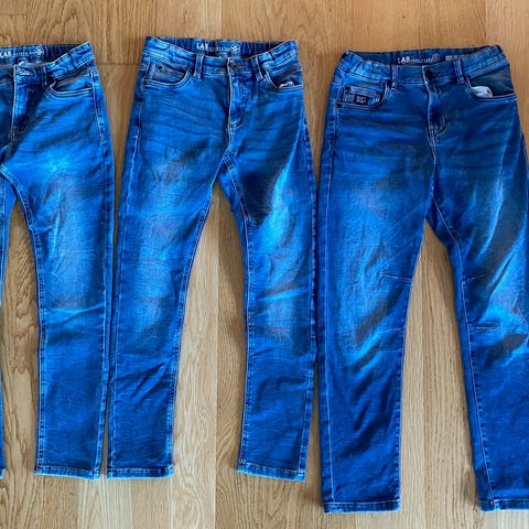 Tre bukser i str 152. Obs! De er smale i fasongen! Så har du en gutt som er lang og smal, er disse perfekte. To jeans, en relaxed og en slimfit. 1 cargobukse.