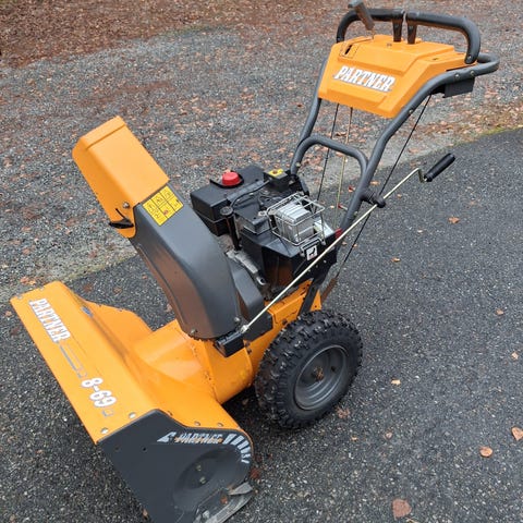 Har startet den opp og fungerte helt OK. Den kaster snøen fra 5 til 8 meter