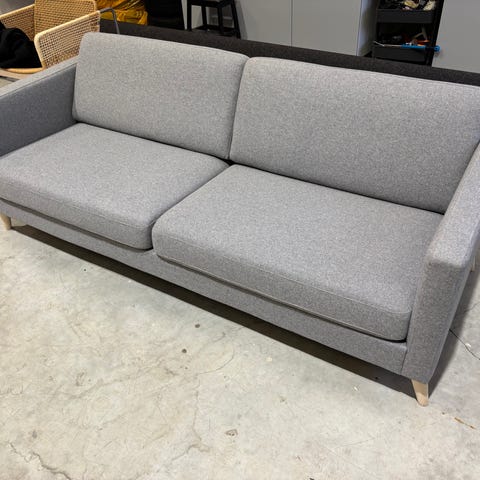 Sofaen har en svak burform og putene har god dunkvalitet.
