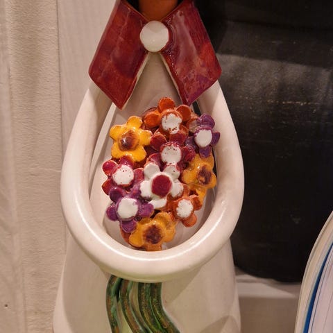 Dekorativ keramisk skulptur, ca. 35 cm høy. Figuren forestiller en kledd skikkelse som holder en skål egnet for telys. Glasert i lyse naturtoner med patinert uttrykk. Fremstår som eldre/retro produksjon, men uten produsentstempel eller signatur.