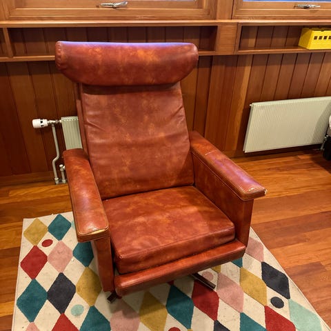 Designet av Ingmar Relling og produsert hos Modi-Scand. Modellen heter Optima, dette er en uvanlig utgave med høyere og bredere nakkestøtte som også kan justeres.