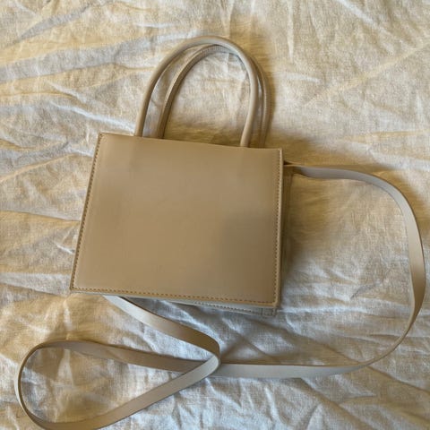 H&M dameveske laget av kunstlær i brun. Vesken har en skulderrem og en beltedetalj i gull.