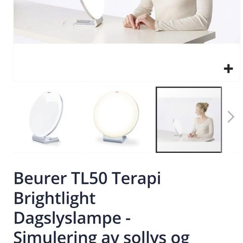 Enkel lampe med ulike styrker, farger og timer (15/30/45/60). Styrken tilsier at man må sitte nærme, 10-15 cm, for mest effekt. (Jeg målte høyest uoffisielt 10.000 lux med mobil app med denne avstanden).