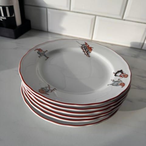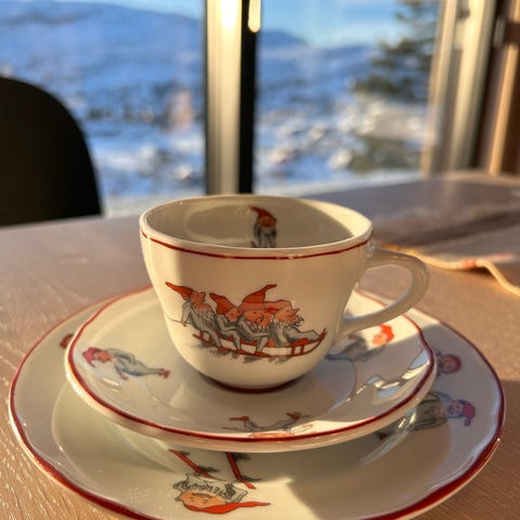 Asjett fra serviset Nisse fra Porsgrunds Porselænsfabrik. Skøyeraktige norske fjøsnisser pryder den tradisjonsrike serien som har røtter helt tilbake til 1898, da den 14/15 år gamle datteren til daværende fabrikkeier tegnet de sagnomsuste nissestrekene. Asjettens størrelse på 17,5 cm gjør den utmerket som frokost- eller desserttallerken.