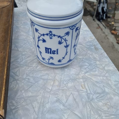 Jäger Eisenberg , Original Blau Sachs eller Stråmønsteret som vi sier. Tysk kvalitetsporselen. To krukker med lokk for oppbevaring av Salt og Sukker. Høyde inkl lokket er 17 cm. Begge er feilfrie, pene og blanke i glasuren.