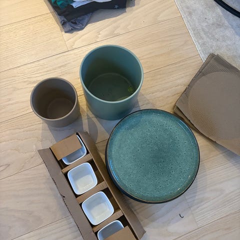 Kopper, matboks, drikkeflaske gis bort.