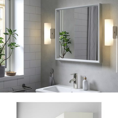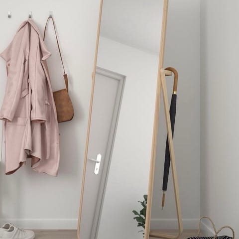 IKEA speil med stativ i hvit farge. Speilet har en enkel og funksjonell design med støtte for gulvplassering. Passer for bruk i hjemmet for personlig pleie og romdekorasjon.