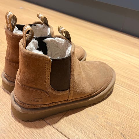 UGG M Neumel Chelsea vinterstøvler i størrelse 41. Støvlene er laget av beige semsket skinn og har en fôr av ull. Designet som Chelsea-støvler med elastiske sidepaneler for enkel på- og avtakning. De er helt nye. Retur fristen gikk ut. Sønnen min måtte ha størrelse 42.