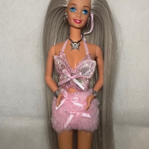 Retro fra 80/90-tallet. Barbie dukke med langt blondt hår og to kjoler i ulike farger og materialer. Den ene kjolen er rosa overdel og rosa skjørt med glitter, den andre kjolen er blågrønn med hvit og glitter. Dukken egner seg som lekefigur.