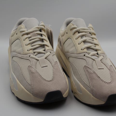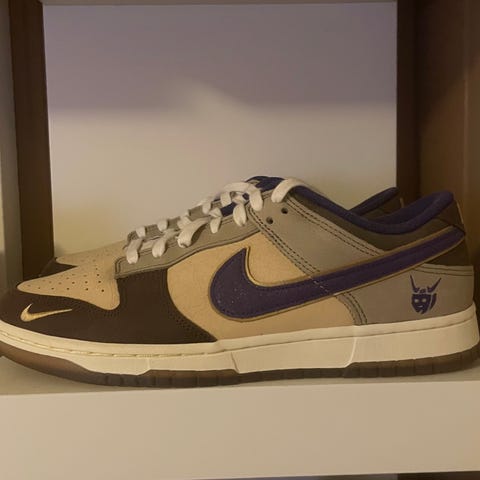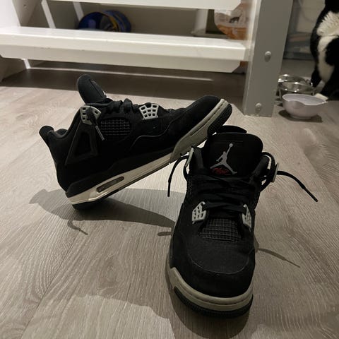 Air Jordan Sneakers joggesko i størrelse 43. Skoene har en kombinasjon av fargene hvit, beige og grå, med rødt merke på siden. Designet for daglig bruk og sportsaktiviteter.