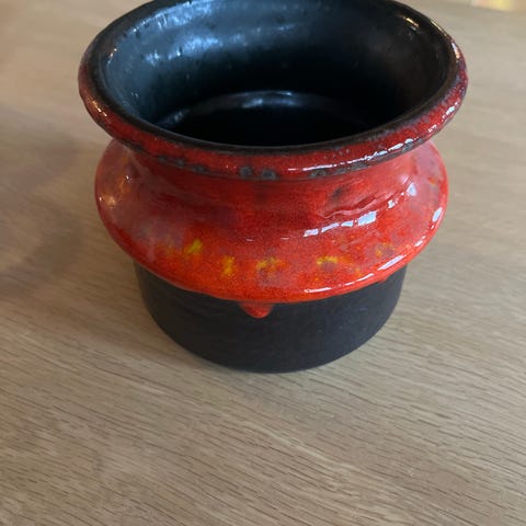1 mindre vase/kande i varme toner av oransje, brun og sort -150 kr