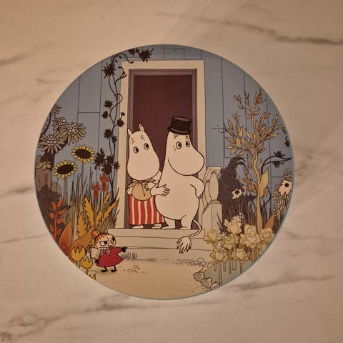 &Tradition Mummi glass sett med 6 fargerike kopper med Mummi-motiv. Glassene har forskjellige farger og illustrasjoner av Mummifigurer, egnet for samling eller daglig bruk. Sjeldne.